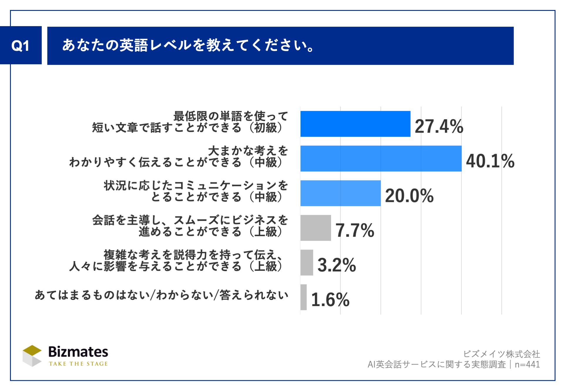 「Q1.あなたの英語レベルを教えてください。」(n=441)の回答では、「大まかな考えをわかりやすく伝えることができる(中級)」が40.1%、「状況に応じたコミュニケーションをとることができる(中級)」が20.0%となり、中級レベルが全体の6割以上を占めました。さらに、「会話を主導し、スムーズにビジネスを進めることができる(上級)」が7.7%、「複雑な考えを説得力を持って伝え、人々に影響を与えることができる(上級)」が3.2%で、上級者は合計10.9%に達しました。これらの結果から、AI英会話サービスと人との英会話学習の両方を活用しているビジネスパーソンの多くが、中級以上の英語力を有していることがわかります。
