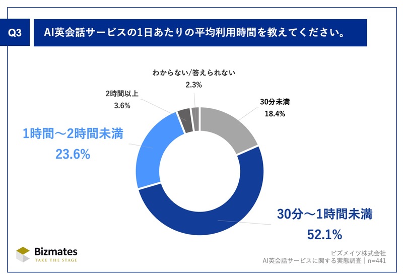 「Q3.AI英会話サービスの1日あたりの平均利用時間を教えてください。」(n=441)の回答では、「30分~1時間未満」が最も多く52.1%を占めました。次いで、「1時間~2時間未満」が23.6%、「2時間以上」が3.6%と続き、79.3%が「30分以上」利用していることがわかりました。