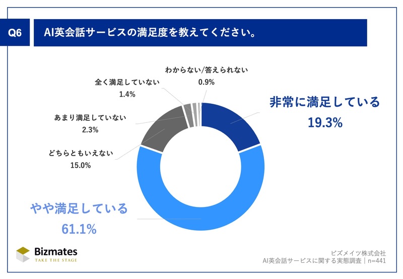 「Q6.AI英会話サービスの満足度を教えてください。」(n=441)の回答では、「非常に満足している」が19.3%、「やや満足している」が61.1%となり、8割以上が肯定的に評価していることがわかりました。