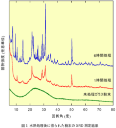 使用済み太陽光パネルからカバーガラスを外して粉砕し、粉末状としました。得られた粉末を密閉容器で水と混ぜて攪拌しながら、一般的な圧力容器の標準設計温度以下で1時間から6時間の水熱処理を行いました。水熱処理後に得られたスラリーは遠心分離により液相と沈殿物(粉末)に分離しました。得られた粉末について、XRF分析によるアンチモン抽出率の算出(各試料のシリカ(SiO2)に対するSb2O3含有率により定義)とX線回折(XRD)法による生成物の同定を行いました。XRF分析によるアンチモン抽出率の算出結果から、処理時間に伴い抽出率が上昇する傾向を示し、6時間処理後には約8割に達することがわかりました(表1)。また、XRD測定の結果より、水熱処理後の試料において、ガラスの主成分であるケイ素を含む結晶に帰属可能な回折線が確認されたことから、これらの条件における水熱処理を経て結晶化されていることが確認されました(図1)。これらの回折線は処理時間の経過とともに強度が増大し、半値幅も狭くなることから結晶の成長が確認されました。