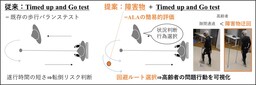 通常、この予測的歩行調整能力を測るには、高性能な三次元動作解析システム(モーションキャプチャ)を利用する必要があります。このため、高齢者の転倒予防評価など、大人数を対象とする転倒関連調査では、予測的歩行能力を評価することができませんでした。そこで本研究では、国際的に普及する転倒関連評価法に、わずかな改良を加えることで、高齢者の予測的な歩行調整能力を簡便に測る手法を考案しました。利用できる評価法として着目したのが、「Timed Up and Go test:TUG、図1左:用語2)」という国際的認知度の高いバランステストです。TUGは椅子から立ち上がり、3 m先の目標を迂回して椅子に戻るというシンプルな課題でありながら、複合的な動作を含み、予期的歩行調整の要素を反映しています。本研究では、このTUGをバージョンアップすることで、予期的歩行調整能力を簡便かつ直接的に評価する方法を検討しました。