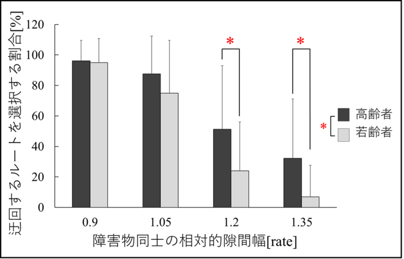 図2. 迂回ルートを選択する割合。参加者の肩幅の相対値(0.9倍、1.05倍、1.2倍、1.35倍)の隙間幅で自由に回避を行った際の迂回ルート選択割合を示す。高齢者は、隙間幅が広い条件(1.2倍・1.35倍)でも、隙間通過の所要時間が短くても、迂回ルートを選択する傾向が示された。