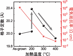 ■大気中での加熱によりSr3Cr2O7-δ薄膜に対して層状構造を維持したまま酸素を挿入すると室温における電気抵抗が約20万分の1に低下した。