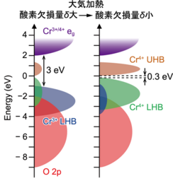 図3. Sr3Cr2O7-δの大気加熱前後でのバンド構造の模式図。