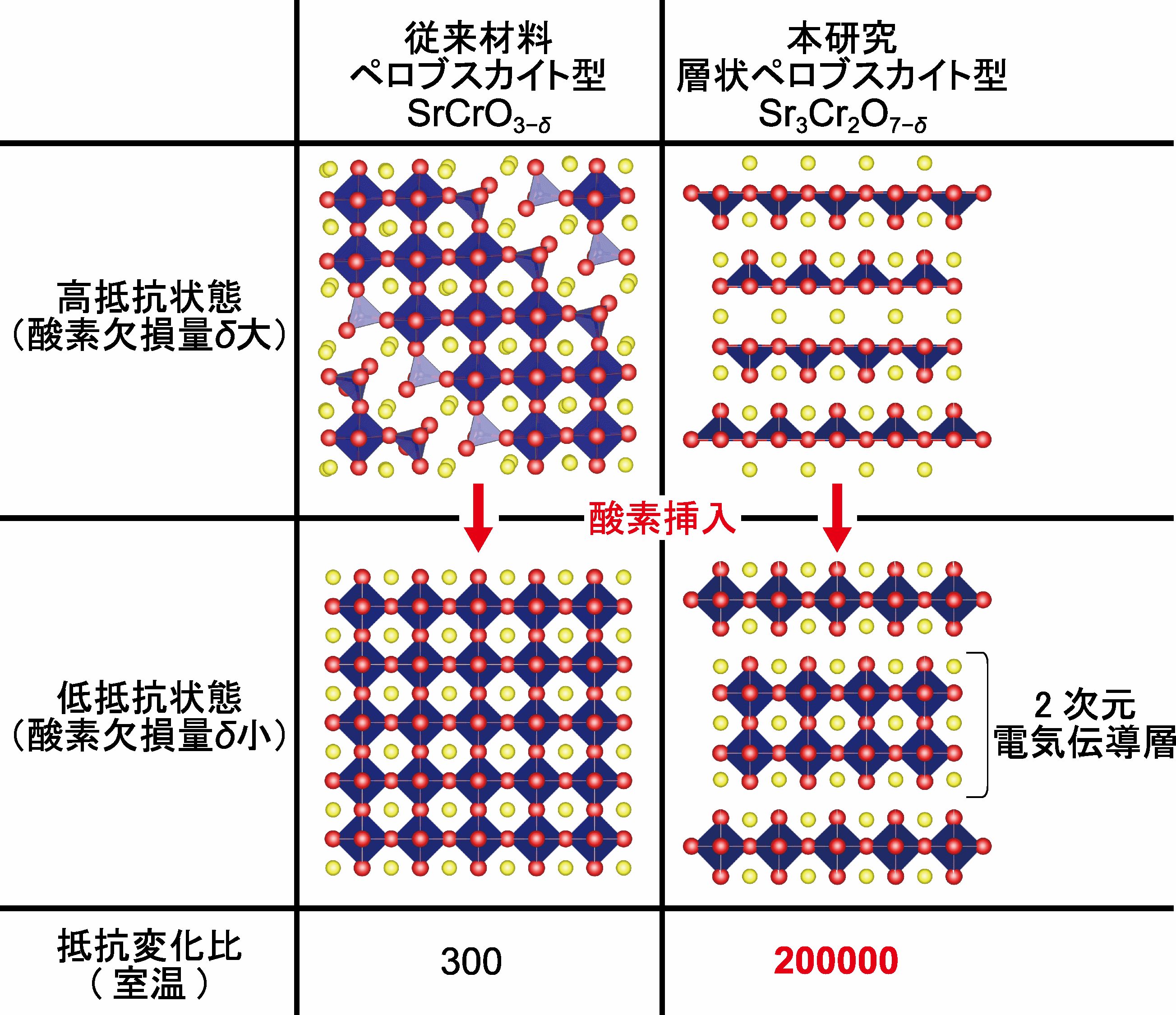 図1. 従来材料SrCrO3−δと本研究で合成した Sr3Cr2O7-δ の酸素挿入前後の結晶構造と抵抗変化比。