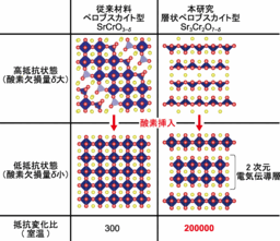 電子相関効果(注3)の強い遷移金属酸化物は、温度や電場、磁場などによって結晶構造や化学組成を変調すると大きな性質変化を示すため、機能性材料として幅広く研究されています。特に、酸素量に不定比性(注4)がある遷移金属酸化物では、化学的に酸素を脱挿入することで電気抵抗をはじめとする電子物性を制御できるため、次世代メモリーや高感度センサーとしての応用が期待されています。これまでの研究で、3次元的なペロブスカイト型の結晶構造を持つ遷移金属酸化物のエピタキシャル薄膜が大きな抵抗変化比を示すことが知られていますが、デバイス化すると抵抗変化の大きさが抑制されてしまうため、従来材料よりも大きな抵抗変化比を示す材料の開発が求められています。