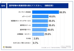 Q7で「語学研修」と回答した企業(n=142)に対し、実施形態を尋ねたところ、「オンライン英会話」66.9%が最多で、次いで「eラーニング」40.8%、「短期集中コーチングサービス」「通学型スクール」各39.4%が続きました。時間や場所の制約を受けにくいオンライン形式が中心となる一方で、「公開講座・セミナー」29.6%などの対面型研修は、ネットワーキングや情報共有の場として依然重要です。矢野経済研究所の調査でも示されているように、オンラインやeラーニングの普及は研修市場の成長を支える要因となっており、企業はコスト効率と研修の実効性をどう両立させるかが課題となっています。