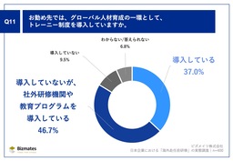 「Q11.グローバル人材育成の一環として、トレーニー制度を導入していますか。」(n=400)では、「導入している」37.0%、「導入していないが、社外研修機関や教育プログラムを導入している」46.7%となり、合計で8割以上の企業が何らかの形でグローバル人材育成に取り組んでいることがわかりました。