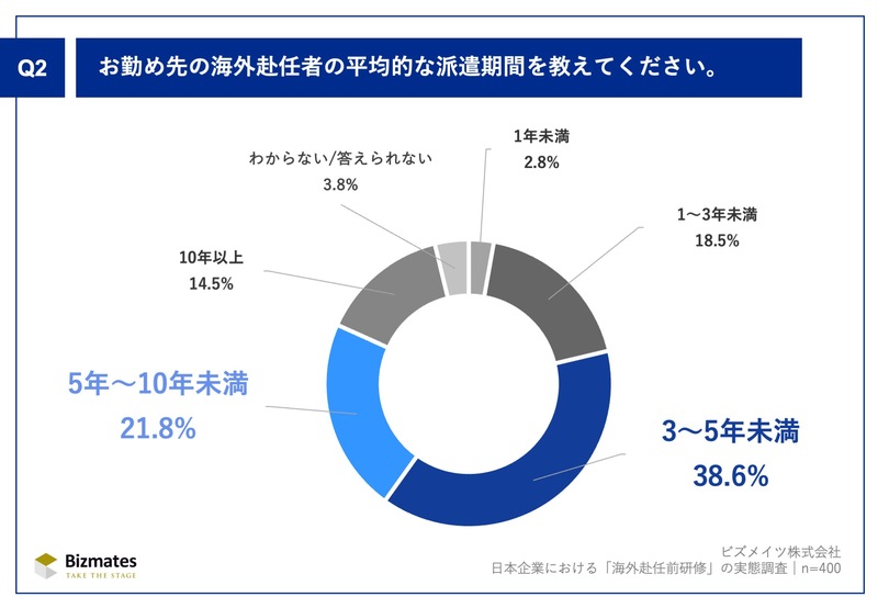 「Q2.お勤め先の海外赴任者の平均的な派遣期間を教えてください。」(n=400)の回答では、「3~5年未満」が38.6%で最多となり、「5年~10年未満」が21.8%、「1~3年未満」が18.5%と続きました。この結果から、多くの企業が3年以上の中期的な派遣を前提としており、現地での事業展開や人材育成には一定の時間をかける必要があると認識している実態が浮かび上がりました。特に「5~10年未満」や「10年以上」といった長期派遣も3割を超えており、海外赴任が一過性ではなく、組織的な経験蓄積や現地ネットワークの形成を重視した施策であることがうかがえます。