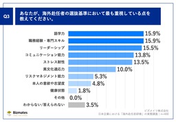 「Q3.海外赴任者の選抜基準において最も重視している点を教えてください。」(n=400)の回答では、「語学力」15.9%、「職務経験・専門スキル」15.9%、「リーダーシップ」15.5%がほぼ同率で上位を占めました。続いて「コミュニケーション能力」13.8%、「ストレス耐性」13.5%が挙げられています。