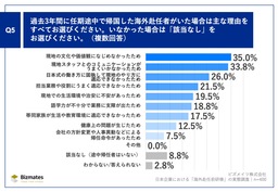 「Q5.過去3年間に任期途中で帰国した海外赴任者がいた場合の主な理由」(n=400)では、「現地の文化や価値観になじめなかったため」35.0%、「現地スタッフとのコミュニケーションがうまくいかなかったため」33.8%が上位となりました。一方で「語学力が不十分で業務に支障が出たため」は18.8%にとどまり、語学力そのものよりも、異文化適応力や人間関係構築力の不足が早期帰任の主要因となっている実態が明らかになりました。「日本式の働き方に固執して現地のやり方に適応できなかったため」26.0%という回答も4人に1人の割合で見られ、日本のビジネス慣習をそのまま持ち込むことの限界を示しています。さらに、「帯同家族が生活や教育環境に適応できなかったため」17.5%という家族要因も無視できず、赴任者本人だけでなく家族を含めた包括的な支援の必要性が示唆されました。
