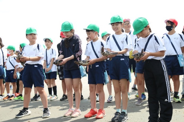 御前崎市は、国際的な絶滅危惧種であるアカウミガメの日本有数の産卵地であり、約50年にわたり保護活動を継続しています。その活動の中、御前崎小学校では毎年、御前崎市の海岸で産卵され、ふ化した子亀を預かって飼育し、児童の手で海へ放流する取り組みを、環境教育の一環として行っています。