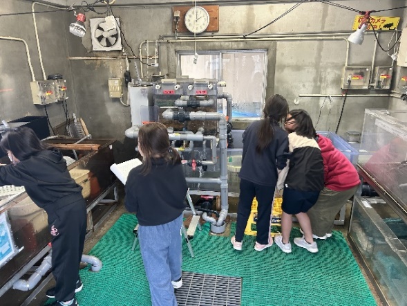 プロテインスキマーの手入れ方法の説明を聞く児童たち