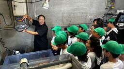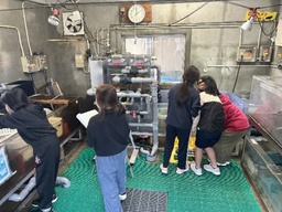 寄贈式には、4年生と5年生の児童54人が参加。寄贈式の後には、アカウミガメの飼育室で、水槽に設置されたプロテインスキマーの見学会が実施されました。プロテインスキマーによって水がきれいになる様子や、手入れ方法の説明を受け、「大切にプロテインスキマーを使って、元気な亀に育てたい」といった声があがりました。