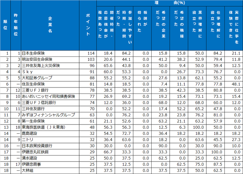 2年連続1位の日本生命保険は「5日間かけて実際に仕事を体験でき、理解が深まった」と「仕事理解」で評価されたほか、「参加しやすい時期・期間」でも評価されました。「グループ作業が多く楽しかった」と学生の満足度は高いようです。2位の明治安田生命保険も「業界や仕事についての理解はもちろん、志望する部署の方に直接話を聞けて働くことへのイメージが明確になった」と「業界理解」や「仕事理解」での評価が目立ちました。