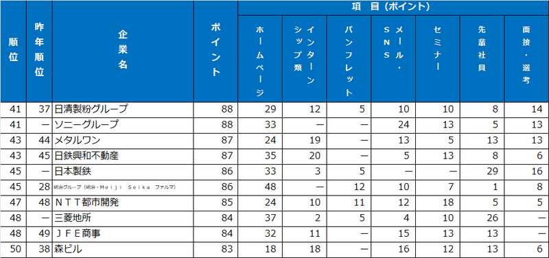 『新卒採用力ランキング調査』 では、企業の採用広報、選考活動を(1)ホームページ (2)インターンシップ類 (3)パンフレット・入社案内 (4)メール・SNS (5)セミナー・説明会 (6)先輩社員・懇談会 (7)選考・面接 の7つの分野ごとに学生の評価を聞いています。そして、各分野のポイント合計を企業の「新卒採用力」と定義し、総合ランキングを出しています。