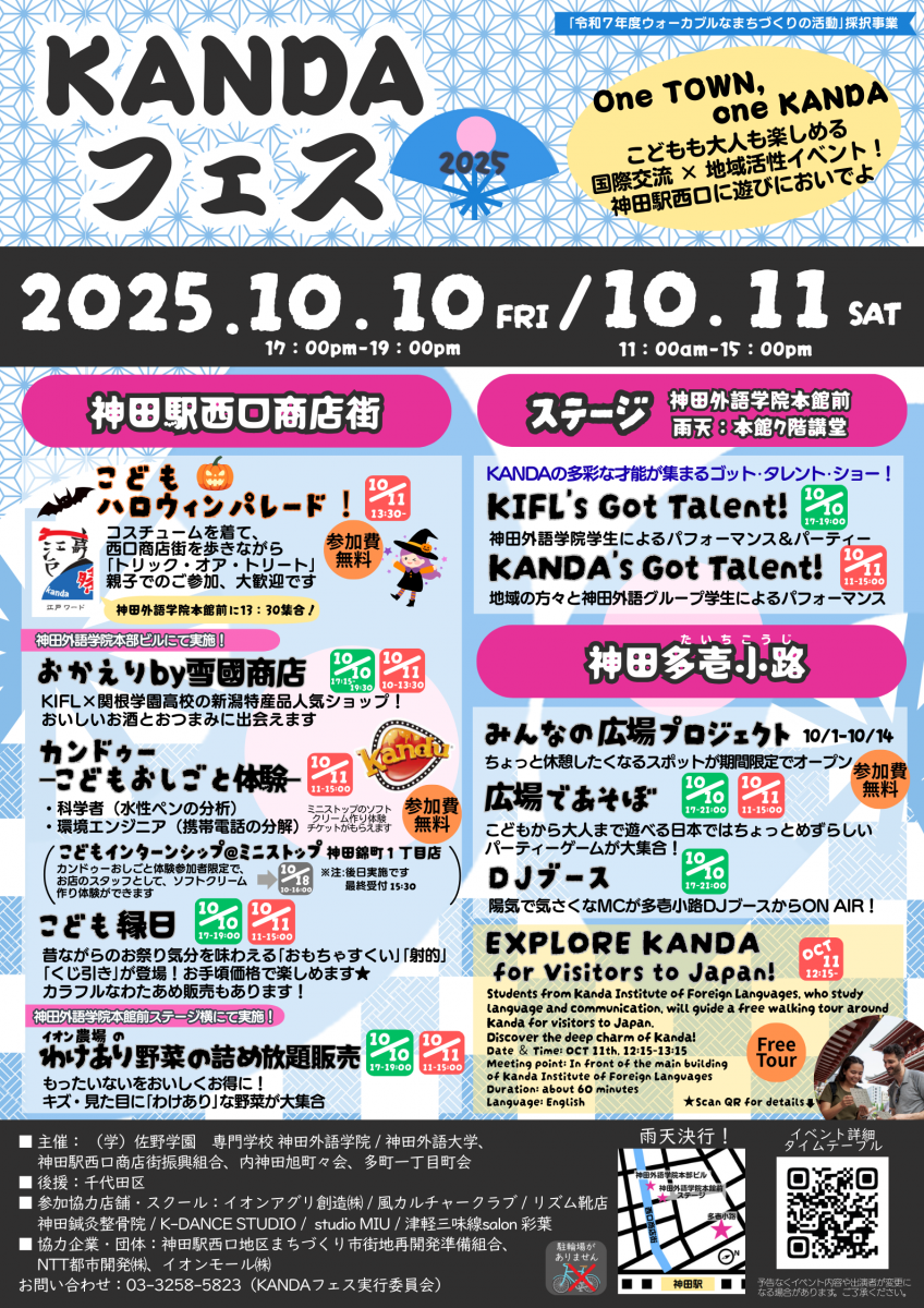 神田外語グループ(東京都千代田区/理事長:佐野元泰)は、千代田区後援の下、神田駅西口商店街振興組合、内神田旭町々会、多町一丁目町会等の地域、及びNTT都市開発株式会社、イオンモール株式会社等の企業と連携し、地域共創イベント「KANDAフェス2025」を2025年10月10日(金)・11日(土)の2日間、神田駅西口エリアにて開催いたします。本フェスは、千代田区推進する「ウォーカブルなまちづくり」の理念を背景に、公共空間を活用して人々が集い滞在したくなる場を創出するものです。地域住民・在勤者・在学者・来街者が交流できる機会を設けることで「顔の見える関係性」と「まちの一体感」を育み、神田の歴史・文化を再発見するともに、多文化共生や国際交流を発信し、地域ブランドの向上を目指します。 |