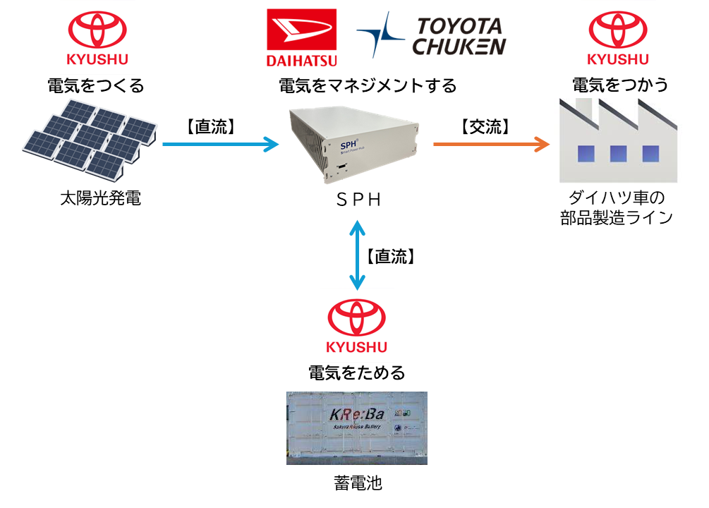 今回の実証実験では、トヨタ九州・小倉工場において、豊田中研とダイハツが共同開発したSPHを活用し、太陽光発電で作られた電気を部品製造ラインに供給するとともに、余った電気は蓄電池に貯めることで、効率的に電力を活用するマイクログリッドシステムを構築。実際に稼働している製造ラインでの実証を通じて、システムの有効性ならびに信頼性を確認し、将来的にはエネルギーの地産地消や、日中に蓄電した電気を夜間に使用するピークシフトを実現することで、CO排出量の削減につなげていきます。