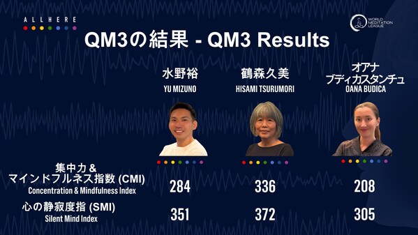 Among the challengers — Oana Budicastancu, Hisami Tsurumori, and Yu Mizuno — Ms. Tsurumori achieved the highest QM3™ score. "I began meditation due to illness nearly two decades ago and have practiced every day since," she shared. "If you're feeling stressed & anxious in your life, I hope meditation brings you inner peace as it did for me."