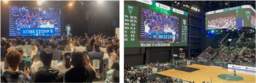 また、両会場にMCを配置し、IOWNの低遅延通信を利用してリアルタイムな掛け合いと応援の扇動を実施しました。これにより、万博会場とGLION ARENA KOBEが時間差を感じさせない一体感で繋がり、参加者全員が熱狂的な応援を共有する観客参加型の演出に成功しました。