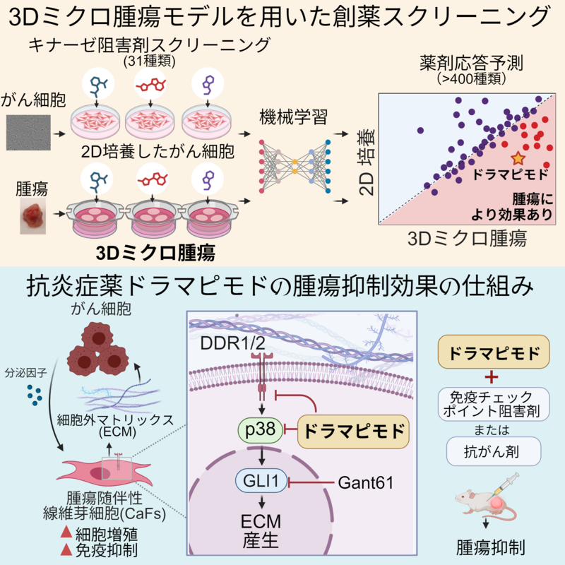 <発表のポイント> ・体内に近い立体的ながん組織(3Dミクロ腫瘍)を使った創薬スクリーニングにより、従来の方法では見逃されていた、がん細胞のまわりにある「サポート役」の細胞の働きを弱める薬を多数発見しました。 ・「ドラマピモド」という薬が、サポート役の細胞の一つである腫瘍随伴線維芽細胞の働きを抑制することでがん増殖を抑え、既存の抗がん剤や免疫治療薬との併用効果を高めました。 ・3Dミクロ腫瘍を用いた創薬スクリーニングは、がん細胞の「サポート役」の細胞を狙い撃つことで治療効果を上げる、新しいタイプのがん治療法の開発につながると期待されます。 |