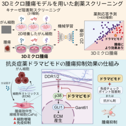 今回、早稲田大学高等研究所の西田奈央講師と米国Fred Hutchinson Cancer Centerの研究チームは、実際の腫瘍に近い“3Dミクロ腫瘍モデル”を用いて、機械学習と組み合わせた新たな薬剤スクリーニング手法を開発しました。マウスの乳がんや膵がんモデルを用いて、400種類以上の薬剤をスクリーニングしたところ、「ドラマピモド」という、がん細胞を直接攻撃するのではなく、がん細胞をサポートする腫瘍随伴線維芽細胞を標的とする薬剤を見出しました。このドラマピモドの作用機構を調べる過程で、細胞外マトリックスを生産する経路として、新たに非古典的ヘッジホッグ経路「DDR1/2–MAPK12–GLI1」を見出しました。