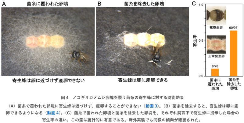 それではなんのためにノコギリカメムシは卵に菌を接種するのでしょうか?卵塊が菌糸で覆われることになにか意味があるのでしょうか?ノコギリカメムシの野外集団を調査したところ、高頻度で卵が寄生蜂の寄生を受けていることがわかりました。卵が菌糸に覆われていると、寄生蜂は卵に近づくことができず、うまく寄生できません(図4A;動画3)。一方で、菌糸の量が少なかったりまばらだったりすると、寄生蜂は卵に近づいて産卵管をさしこむことができ、寄生が成立します(図4B;動画4)。菌糸に覆われた卵塊と、菌糸を筆でそっと取り除いた卵塊を飼育下および野外で寄生蜂に提示したところ、いずれにおいても菌糸を取り除いた卵塊の方が有意に高い割合で寄生蜂に寄生されることが示されました(図4C)。すなわち、卵を覆う菌糸には寄生蜂への防衛効果があり、ノコギリカメムシの後脚器官は卵防衛のための糸状菌を培養する防衛共生器官であることが判明しました。