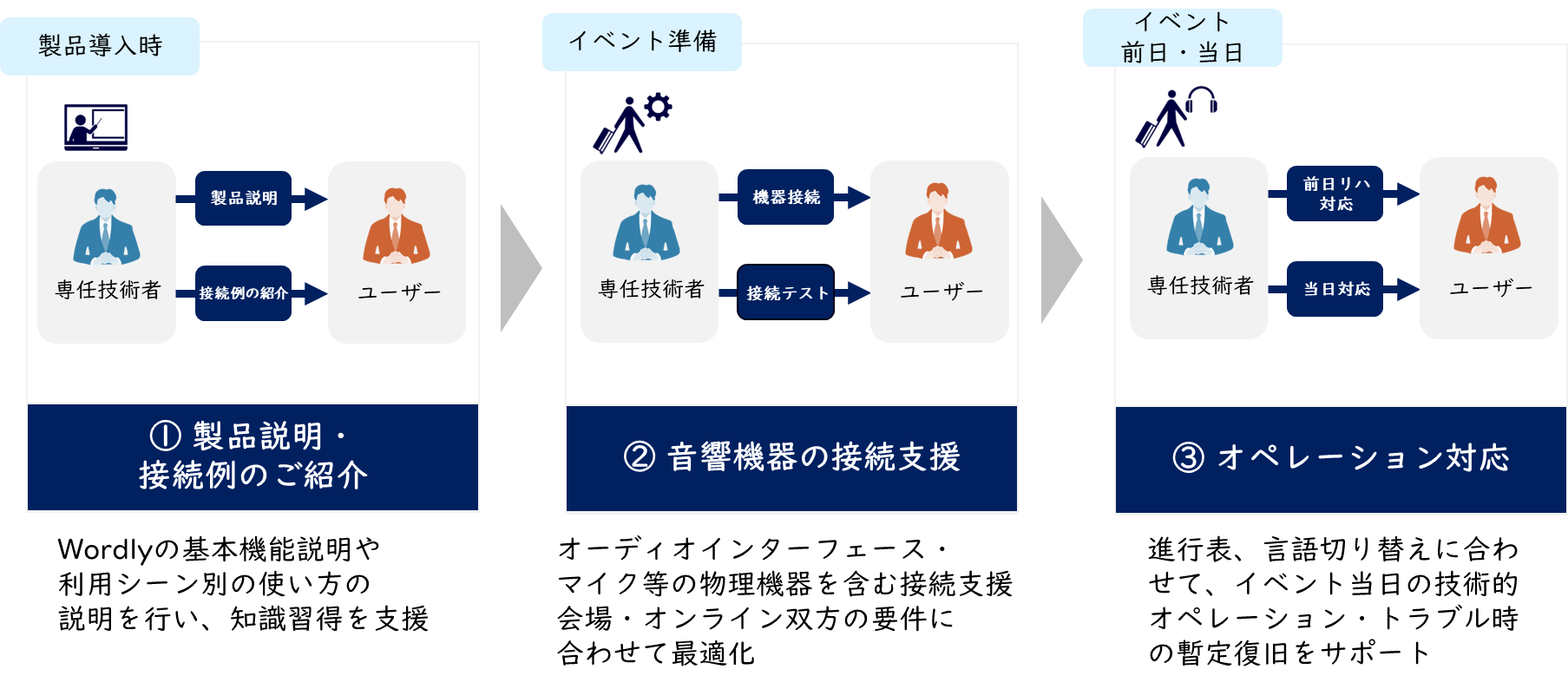 | ■本サービスの特長 ① イベントの特性に応じたWordlyの適切な利活用支援 ② 会場・配信環境に応じた技術支援(音響・接続・表示対応) マイク・オーディオインターフェース等の物理機器を含む接続支援に対応会場・オンライン双方の要件に合わせて最適化 ③ イベント当日の技術運用&トラブル対応サポート 進行表、言語切り替えに合わせて、イベント当日の技術的オペレーション・トラブル時の暫定復旧をサポート |