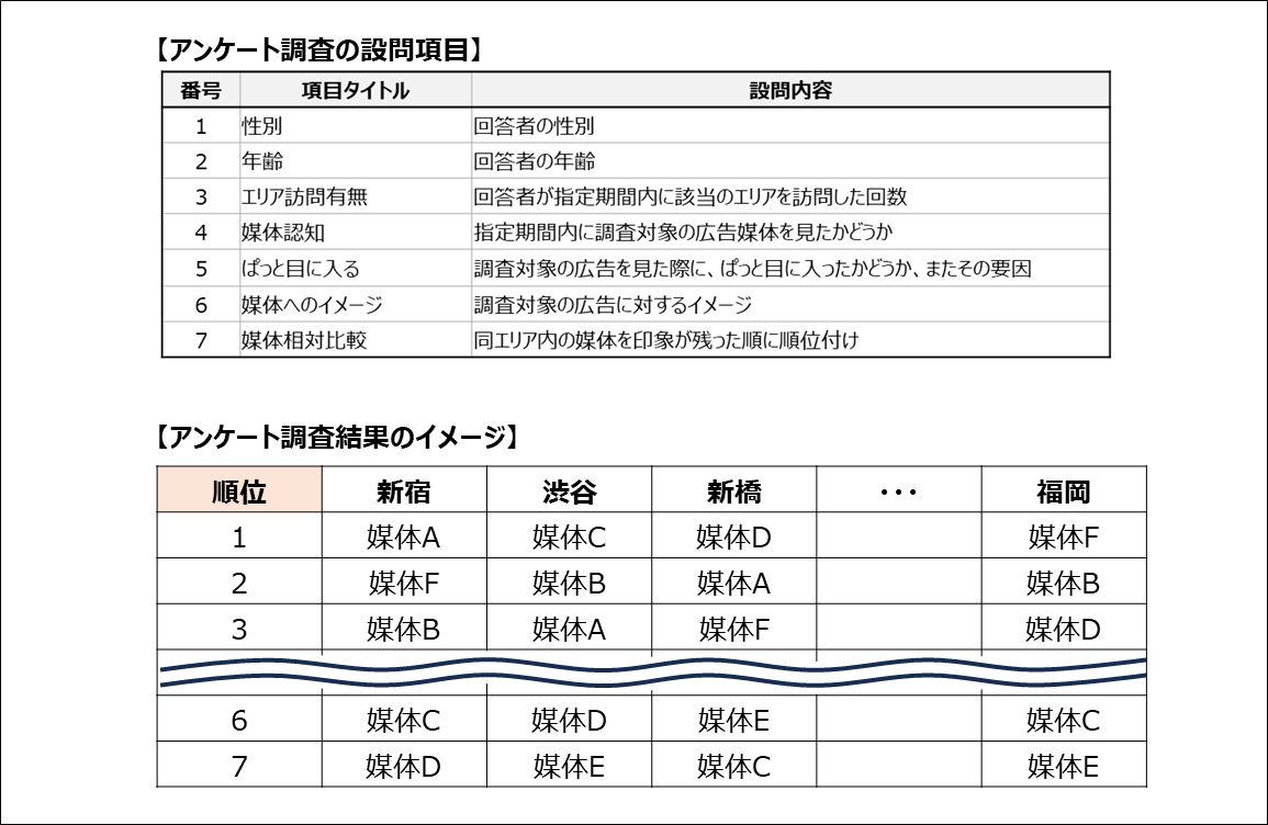 サントリーが出稿したOOHを中心に、新宿駅、渋谷駅など東京の主要エリアに加え、仙台や福岡などの地方主要都市を含む全18エリアを対象に、視聴者の広告へのイメージや広告の設置位置や掲出サイズなどによる視聴者への影響度合いなど、広告のインパクトを定量的に計測しました。インパクトの計測では具体的に以下2つのアンケート調査とスコアリングを行い、その結果をもとにエリアごとの広告インパクトを測定しました。