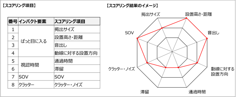 具体的には、広告への接触回数を計測するアクチュアル計測※5および、お客さまの広告へのイメージや広告の設置位置、掲出サイズなどの視聴者への影響度合いなど、広告へのインパクトを定量的に計測し、これら2つの計測結果をもとに効果測定を行いました。