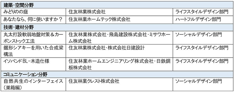 ウッドデザイン賞(主催:(一社)日本ウッドデザイン協会)は木の良さや価値をデザインの力で再構築することを目的に、優れた建築・空間や製品、活動や仕組み、研究等を募集・評価し、表彰する顕彰制度です。(一社)日本ウッドデザイン協会(会長:隈 研吾、東京都千代田区、https://www.jwda.or.jp/)は木を活用した社会課題の解決をめざす取り組みを「ウッドデザイン」と定義しています。住友林業グループは昨年に続き今年度も「建築・空間分野」、「技術・建材分野」、「コミュニケーション分野」の各分野で受賞しました。受賞案件は木を活かして質の高いライフ&ワークスタイルを提案しているものが対象となる「ライフスタイルデザイン部門」、森林・林業や地域・社会の持続性を向上させているものが対象となる「ソーシャルデザイン部門」、心身を健やかにしてウェルビーイングの実現が期待される「ハートフルデザイン部門」に及びました。