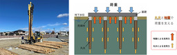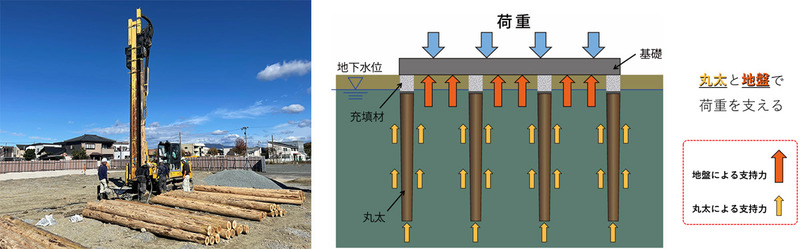 ・丸太を軟弱地盤に圧入し地盤を補強、丸太と地盤の双方で建築物を支える地盤改良工法。