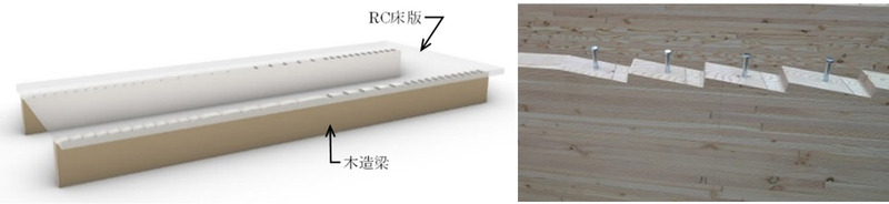 ※1 シアキ―(shear key)とは建築や土木分野で使われる構造部材におけるせんだん力(ずれるように働く力)の伝達要素。 今回の合成梁は、梁に曲げがかかった時に起こる水平方向のせんだん力を木質梁だけでなくRC床版にもシアキ―を介して伝達することで木質梁とRC床版が一体的に挙動する合成構造となる。