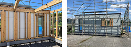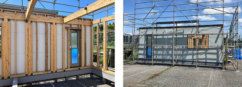 ・イソバンドBLの木造躯体への施工性、手順を検証。大工職と板金業者の混成チームで土台水切りから約半日で施工が完了。工期短縮を実現。