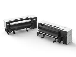 従来製品*5と比べて高さを300mm低減した産業用大判プリンターです。画質や生産性を向上させながら、製品の高さを抑えることで設置空間の圧迫感を軽減しました。さらに、印刷物の確認に活用できるフラットな天面、重量メディアのセットを補助するリフター、メンテナンスのしやすい大型カバーなどを備え、作