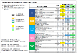 購入行動は、「リアル」を通した直接的働きかけからアプローチすると、反応が高いことが分かりました。また、投資行動は、「メディアの番組・記事」の他には、「企業のウェブサイト(コーポレート情報ページ)」が全体との差(14.6pt)が大きく、効果的であることが分かりました。このように、目標とする行動ごとに効率的なアプローチが存在することがわかります。