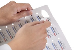 レーザープリンターの差し込み印刷で印字ができ、ハサミなどを使わずに手で剥がして使用することができます。表裏どちらの面にも印刷が可能です。