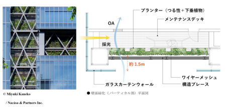 <地上から建物頂部まで連続する高層ビルの壁面緑化ファサード>