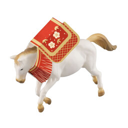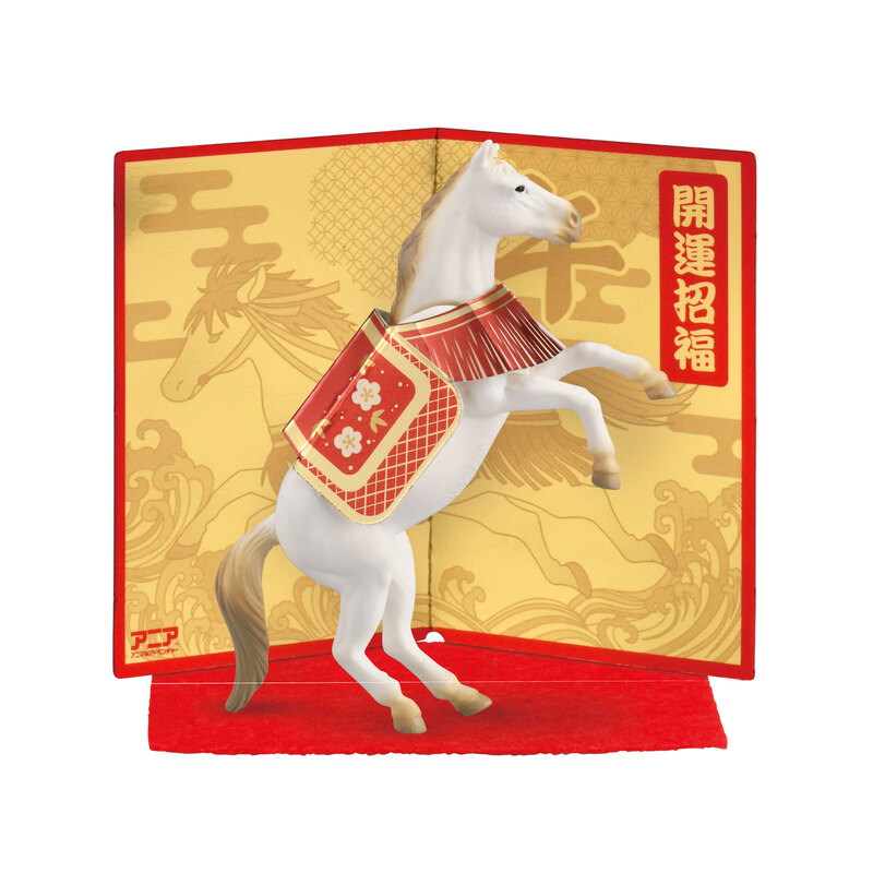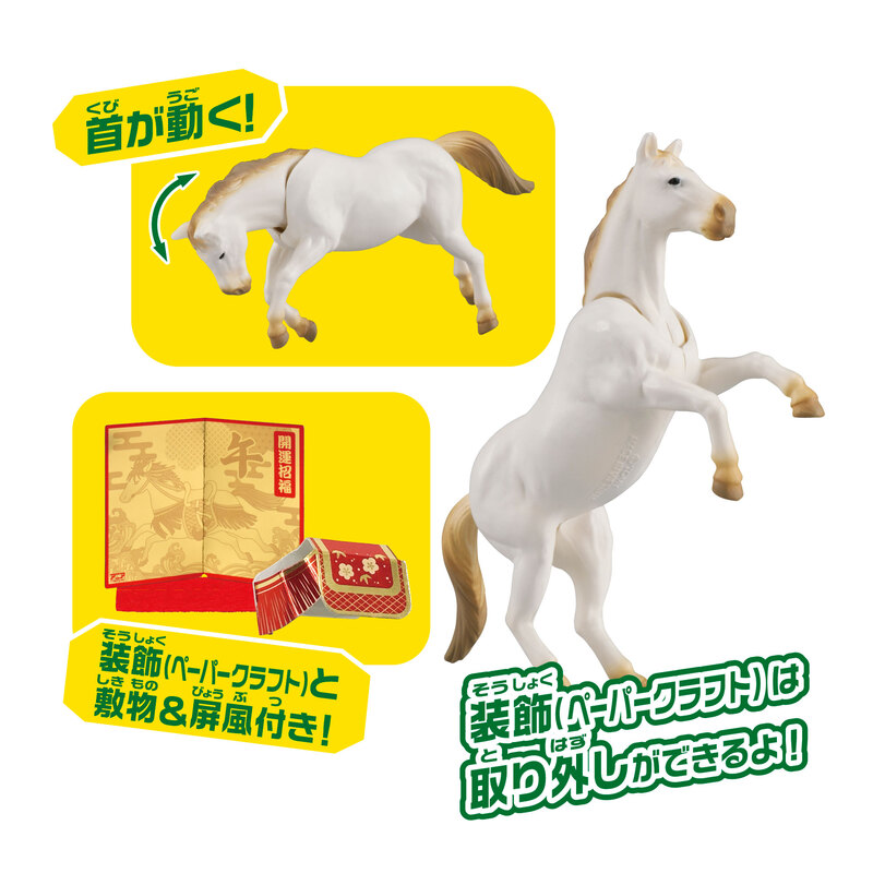 2026年の干支である“午(馬)”は古来より世界の戦において、兵士の命と同じように大切にされてきました。兵士とともに命がけで困難な使命にも立ち向かい、“人馬(じんば)一体(いったい)”で成果を共感できる動物であることから、平和な時代でも縁起の良い勝負運や商売繁盛のシンボルとなり、世界中で愛されています。本商品は、そんな縁起のいい「馬」の中でも新年にふさわしい白いサラブレッドを採用しました。後ろ足で立ち上がる姿のポージングも可能です。また、本商品は儀式のときなどにつける華やかな鞍を付属しました。鞍は干支アニアでは初めてのペーパークラフトを採用しています。