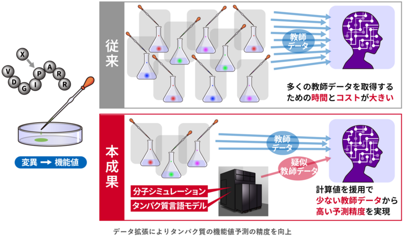 国立研究開発法人 産業技術総合研究所(以下「産総研」という)人工知能研究センター 出口 鉄平 リサーチアシスタント(東京大学大学院 大学院生)、小林 海渡 研究員、齋藤 裕 特定フェローは、分子シミュレーションとタンパク質言語モデルを用いて、機械学習によりタンパク質の機能値を少数の実験データからでも高精度で予測する手法を開発しました。