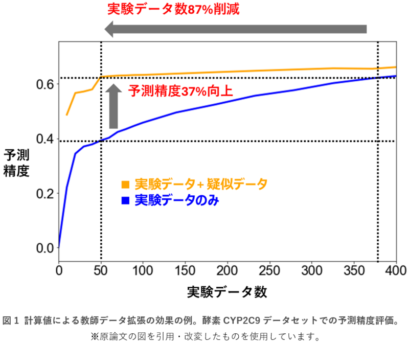 例として、酵素の一種であるCYP2C9の反応活性を予測する問題において、50個の実験データを利用できる状況を想定した評価では、分子シミュレーションとタンパク質言語モデルによる疑似的な教師データを約4,600個追加することで、予測精度を約37%向上することに成功しました(図1)。また、同じ予測精度を達成するための実験データ数を87%削減することにも成功しました(図1)。このような評価を12種類のタンパク質データセットに対して行い、結合親和性、酵素活性、細胞毒性、蛍光強度などさまざまな機能値の予測において本手法の有効性を実証しました。