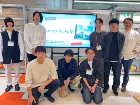 写真左から、杉森 彩乃さん(電気電子工学科3年)、杉山 遥さん(建築学科3年)、前 賢志さん(メディア情報学科2年)、千野 恵汰さん(経営情報学科4年)、丹羽 樹さん(経営情報学科3年)、安部 芳大さん(建築学科4年)、高見 洋杜 さん(経営情報学科3年)、石原正彦 経営情報学科 教授