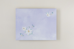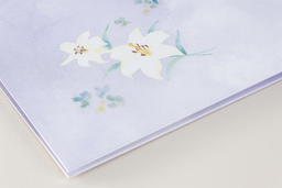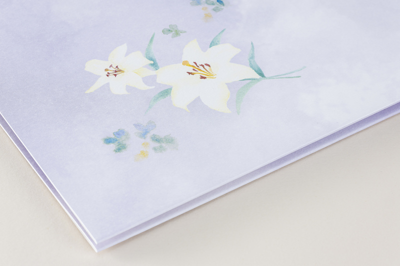 紫を基調とした水彩表現と百合モチーフで、宗教・宗派を問わず幅広く利用可能。言葉を主役に引き立てる落ち着きと温かみを両立させています。