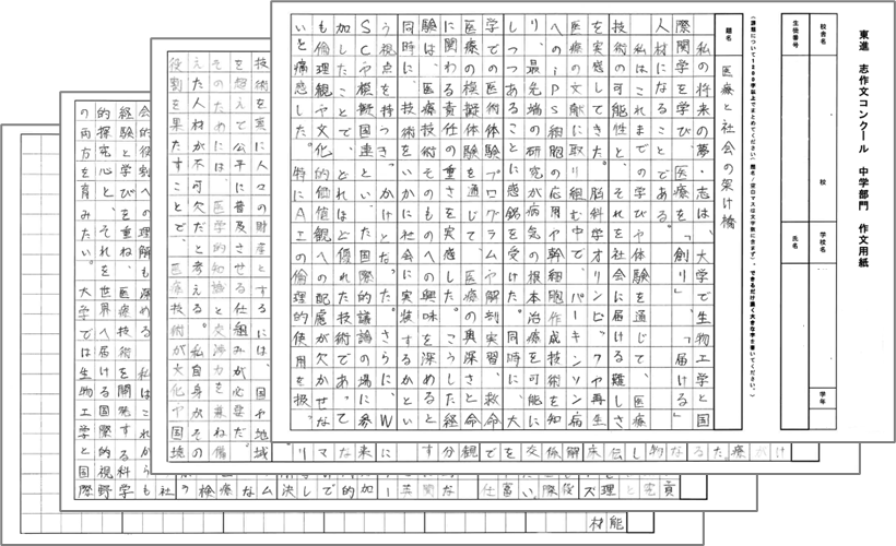 志作文に、全国の東進生が切磋琢磨して前向きに取り組めるよう、東進では毎年「志作文コンクール」を実施しています。中学部門は5回めの実施となり、全国の東進ハイスクール・東進衛星予備校・東進中学NETに通う中学生から、多くの志作文が集まりました。その中から30名の優秀者が決定しました。
