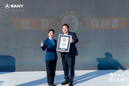 BEIJING, Oct. 23, 2025 /PRNewswire/ -- SANY Group, a leading construction machinery manufacturer, announced that its self-developed Aerial Water Jet Fire Truck JP100 set a Guinness World Record™ for "The Highest Water Jet from a Fire Truck (Prototype)" with a maximum jet height of 159.66 meters at the 21st China International Fire Protection Equipment Technology Conference & Exposition, which concluded on October 16. This certification marks a historic milestone for SANY's emergency rescue equipment, and for high-rise buildings firefighting worldwide.