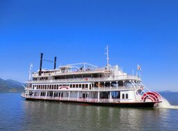 ミシガンクルーズ(写真左)は、赤いパドルが印象的な外輪船で南湖を周遊します。眺望はもちろん、楽しい音楽や多彩なお食事などが楽しめる、滋賀を代表する大型観光船です。
