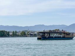 琵琶湖浪漫クルーズ(写真右:屋形船四季)は、普段は見られない湖上から、浮御堂や琵琶湖大橋の真下を通過する迫力の航路。びわ湖の景観と歴史を一度に楽しめる人気の観光クルーズです。