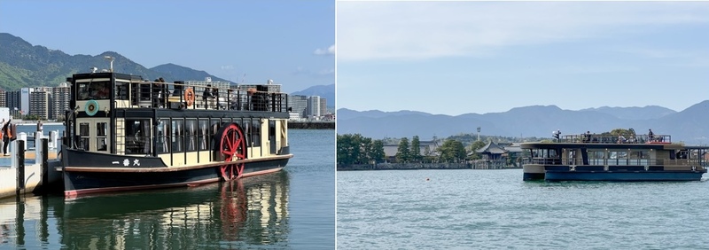 竹生島クルーズ(写真右)は、湖東の長浜港と湖西の今津港どちらからも乗船でき、パワースポット巡礼のほか、周辺観光と併せて、びわ湖を横断する湖上交通としても利用されています。