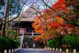 滋賀を代表する古刹で、比叡山延暦寺と並ぶ天台寺門宗の総本山。国宝・重要文化財を数多く有する境内は、秋になると一面が紅葉に染まり、特に観月舞台や観音堂からの眺望が人気です。