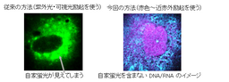 図2 今回の赤色~近赤外光同時励起を用いる手法では、細胞の自家蛍光を含まない正しいイメージを観察することができる。